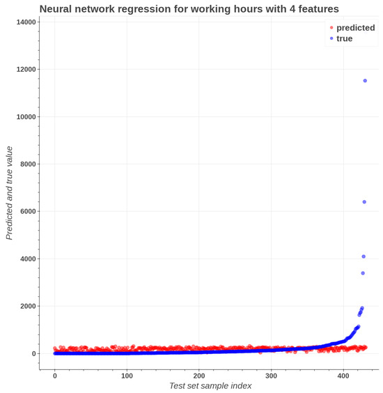 A fully connected neural network [37] was implemented to address the regression problem. Utilizing four layers with 50 neurons each, the neural network achieved an MSE of 93,215.32 and an RRMSE of with the four basic features. When all seven features were used, the MSE increased to 155,141.41, with a corresponding RRMSE of [4]. The optimizer employed was “RMSprop,” and the activation function utilized was the Rectified Linear Unit (ReLU). Figure 4 depicts the prediction results for the four features.