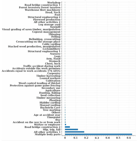 Before examining predictive modeling, histograms were constructed to visually depict the distributions of the input features. It is important to note that the domain cardinality of each input feature significantly influences its relevance. Features, whether continuous or categorical with numerous categories, tend to provide more descriptive information compared to those with fewer categories [31,32]. To address this, certain input features like “injured body part”, “working sector”, and “accident cause” underwent value grouping. For example, accidents impacting the head and neck area were grouped together.