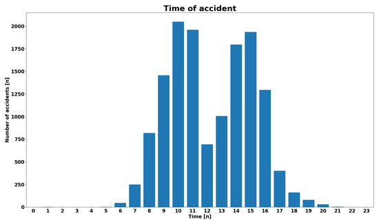 The time when most accidents happened was analyzed in previous studies [7,12] and the results are depicted in Figure 7. Most accidents occurred between 10:00 and 11:00, with another local maximum around 15:00–16:00.