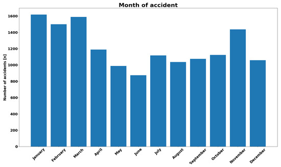 The relationship between the month of the accident and their number was also quite reasonable; January saw the most accidents, with 1618, and June, the least, with 875, as depicted in Figure 8.