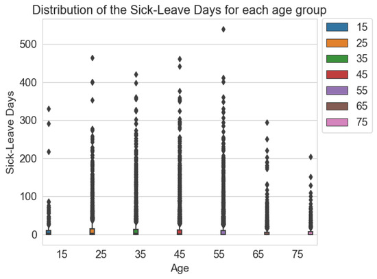Figure 9 depicts the distribution of sick leave days among various age groups. The samples were categorized as follows: (1) under twenty, (2) individuals in their twenties, (3) individuals in their thirties, (4) individuals in their forties, (5) individuals in their fifties, (6) individuals in their sixties, and (7) individuals in their seventies. A notable observation is that the longest sick leave duration values were associated with the fifties age group.