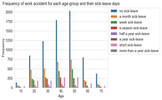 Visualization of the frequency of work accidents categorized by sick leave days across different age groups.