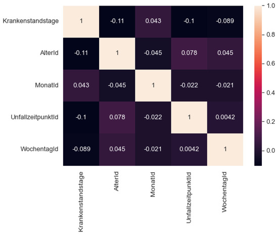 To further examine the correlation among these features, we assumed linearity between each two features and measured the correlations using the Pearson method. This revealed no significant interaction between the features, except for a slight positive correlation between the recorded accident month and sick leave days (in German: “Krankenstandstage”) and a slight negative correlation between the duration of sick leave and age ID. We further calculated the Spearman correlation coefficients with the assumption of monotonic relationships. Similar to the Pearson correlations, we did not observe any significant relationship between the features (see Figure 11). It is important to note that observations with no sick leave days were excluded from this correlation analysis.