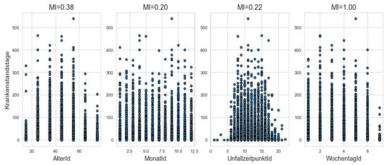 We further calculated the mutual information (MI) between all the discrete features and the continuous target variable sick leave days. Figure 12 depicts the feature and estimated MI values for sick leave days vs. each input variable. MI is a non-negative value that quantifies the dependency between two random variables. It equals zero only when the variables are independent, while higher values indicate a stronger dependency between them. We observed that the sick leave days were highly dependent on the weekdays.