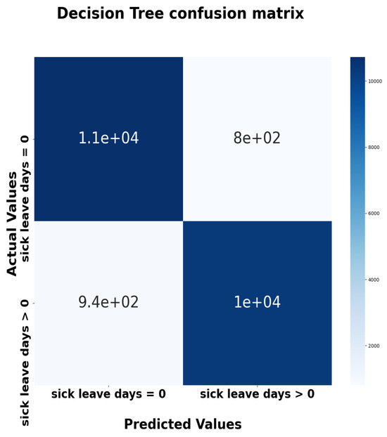 The performance of a decision tree (DT) trained on the aforementioned factors and hyperparameter search is depicted in Figure 13. The number of true negatives (TN) was 10,722, that of true positives (TP) was 10,301, that of false positives (FP) was 801, and that of false negatives (FN) was 945 [33]. The classification had an overall balanced accuracy score of , and the mutual information (MI) was [34].