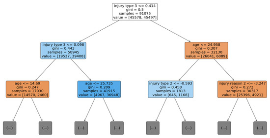 The rules by which the DT decided whether a particular accident case should be predicted as having 0 or >0 hospitalization days are depicted in the Figure 14. For better readability, only the two first levels of the DT are presented. It is observable that the type of injury was selected as the most relevant feature for the classification, which is questionable with respect to expert domain knowledge. This phenomenon can be explained through the aforementioned inductive bias [50], and together with the fact that the decision tree contains the necessary encoding of the input features in its rules, the DT is overall a suboptimal solution for modeling forest accidents.