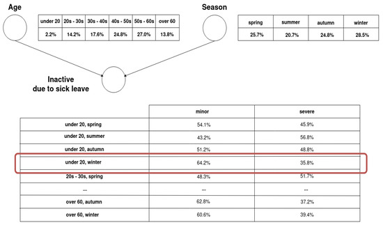 Figure 15 depicts a PGM trained on the AUVA dataset containing only two of the twenty-six possible features. The age RV has six possible outcomes: “under 20”, “20s–30s”, “30s–40s”, “40s–50s”, “50s–60s”, “over 60”. The season RV is deduced from monthly information, and the inactivity due to sick leave has two possible outcomes: “minor” (meaning ≤3 sick leave days because of the accident) and “severe” (>3 sick leave days). The graphical structure of the PGM expresses the prior beliefs of the human domain experts about the causal relationships and dependencies between the RVs. It was assumed that season and age were independent of each other and that the inactivity of the forest worker due to hospitalization was directly caused by those two.