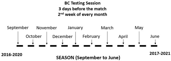 This longitudinal study was carried out in 5 seasons. The first season was 2016/2017 and the last in 2020/2021. The Under14 (U14), U15, U16, U17 and U18 categories were controlled. The season was from September to June. As a marker of the anthropometric status of the players, a monthly control of BC was carried out. The nomenclature used to name the training sessions considers the days prior to the game. That is, Match Day (MD), MD + 1 (1 Day after the match), MD−4 (4 days before the match), MD−3 (3 days before the match), MD−2 (2 days before the match), and MD−1 (1 day before match) [27].