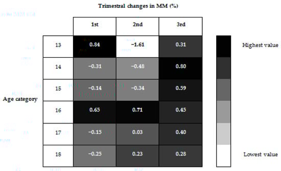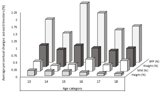 The purpose of this study was two-fold, to compare the trimestral change percentages for each of the variables analyzed (height, weight, body fat percentage, and muscle mass) as a function of the trimester in a sample of adolescent soccer players and to compare the trimestral change percentages as a function of the variables analyzed. Several studies have reported seasonal variations in the physical fitness and anthropometrical variables of young soccer players [29,30]. This study revealed a significant increase in all the anthropometrical indicators analyzed from the start to the end of the season. However, it must be recognized that maturity state is a variable that can influence such changes [29].