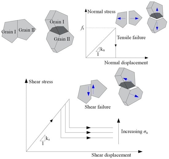 DEM was proposed by Cundall [37], which regards the research object as a collection of multiple rigid or deformable units. In this study, the Mohr-slip joint model is adopted, which assumes a linear relationship between stress and displacement, as shown in Figure 2. Once the stress of the sub-contact element exceeds the strength threshold, the sub-contact element will undergo tensile or shear failure. The specific principle is as follows. In the normal direction of the sub-contact element, it is assumed that the normal stress-displacement obeys a linear relationship, which can be expressed as: