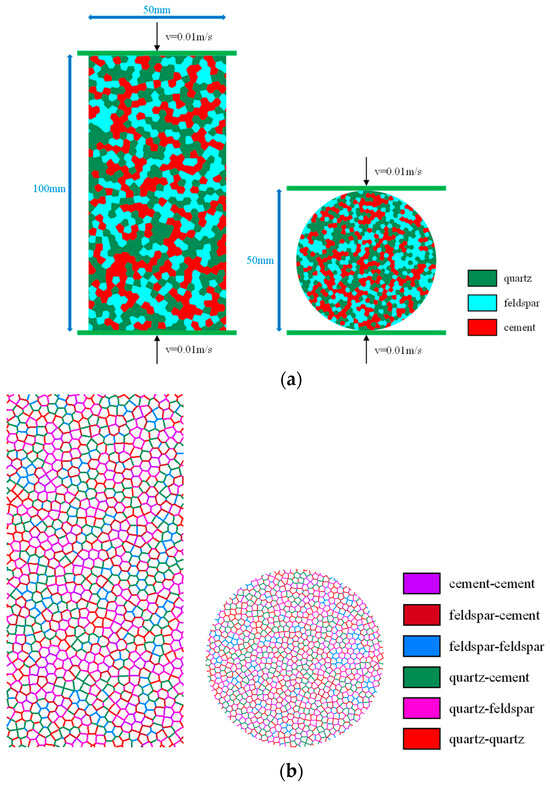 According to the XRD test, the silty mudstone studied in this paper is mainly composed of quartz, feldspar, and cement (e.g., non-clastic minerals), with contents of 35%, 33%, and 32%, respectively. Therefore, the grain-based heterogeneous model should contain three components: quartz, feldspar, and cement, as well as six types of contacts: quartz–quartz contact, quartz–feldspar contact, quartz–cement contact, feldspar–feldspar contact, feldspar–cement contact, and cement–cement contact. The FISH language built into Itasca software is utilized to construct an algorithm to generate the grain-based discrete element (GB-DEM) model. The distribution of material components within the model follows a uniform distribution, and the generation of Voronoi polygons uses the built-in algorithm in the UDEC software. The contents of each material in the numerical model are consistent with the experimental results, as shown in Figure 3. The size of the numerical model is consistent with the test conditions, with the standard cylindrical model having a height of 100 mm and a diameter of 50 mm; the Brazilian disk has a diameter of 50 mm and a thickness of 25 mm, according to the International Society for Rock Mechanics Suggested Methods. The range of loading rates used for uniaxial compression and Brazilian disk tests in the existing literature [35,36,38,39] is 0.01 m/s to 0.1 m/s. Since the default time step size in the UDEC software is about 10−8 to 10−7 s/step, a loading rate of 0.1 m/s is equivalent to loading 10−6 to 10−5 mm per time step. It means that loading 1 mm requires 105 to 106 time steps, indicating that the specimen is under quasi-static loading conditions. Therefore, considering computational accuracy and efficiency, the loading rate is taken as 0.01 m/s.