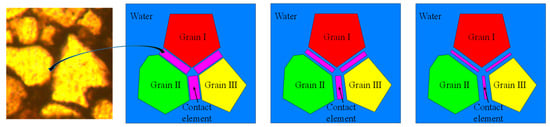 where d(t) is the meso-scale softening damage factor, D is the diffusion coefficient, and t denotes the time of water–rock interaction. The innovative grain-based discrete element model considering the heterogeneity and the softening effect is illustrated in Figure 4. Therefore, the water-induced softening effect under water–rock interaction can be expressed as follows: