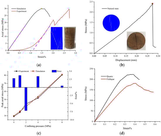 Simulation results based on calibration parameters: (a) uniaxial compression simulation curve and failure mode; (b) Brazilian fracture simulation curve and failure model; (c) simulation error of the peak axial stresses under different confining pressures; and (d) stress–strain simulation curves of the quartz and feldspar models.