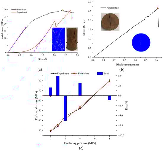 According to Section 2, the meso-scale parameters of the cement can be directly based on the mechanical parameters obtained in the experiments. For minerals, several literature and rock mineral monographs [39,44,45,46] provide the basic mechanical parameters. The mechanical parameters of the three material components are summarized in Table 1. Regarding the meso-scale parameters for the six types of contacts, the contact parameters between the same components were first calibrated. In this paper, the numerical model is regarded as a virtual model containing only quartz or feldspar or cement. The contact parameters for cement–cement contact are equivalent to those of the homogeneous soft rock model. The calibration of the meso-scale contact parameters for the homogeneous model in its natural state are targeted at the average values of the mechanical parameters obtained from experiments. The uniaxial compression, Brazilian splitting, and biaxial compression numerical tests are then conducted. For quartz–quartz and feldspar–feldspar contact, only uniaxial compression numerical tests are conducted to calibrate the uniaxial compressive strength and elastic modulus.