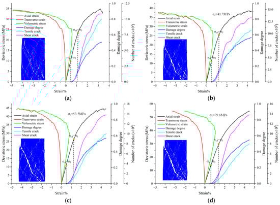 The crack initiation threshold (σci), the crack damage threshold (σcd), the damage degree (D), and the tensile and shear crack ratio are used to investigate the damage characteristics of soft rock under different confining pressures and water immersion durations. Based on previous studies [47,48,49], this paper defines the stress corresponding to the first occurrence of tensile cracks as the crack initiation threshold, and the inflection point of the shear crack curve where it significantly increases as the crack damage threshold. The damage degree refers to the ratio of the length of broken contact elements to the total length of contact elements. The proportion of tensile (shear) cracks is the ratio of the number of tensile (shear) crack elements to the total number of contact elements. The number of cracks and the crack types are both identified and recorded using the built-in FISH language in UDEC software. Since the failure modes of heterogeneous models with different water immersion time are relatively similar, the influence of confining pressure on the damage and failure characteristics is investigated by taking the heterogeneous model in the natural state as an example.