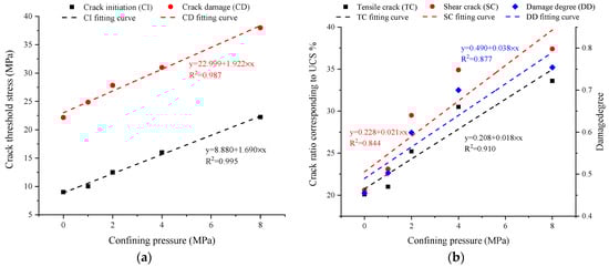 Figure 7 shows the relationship curves between stress, the number of tensile and shear cracks, damage degree, and strain of heterogeneous models under different confining pressures. The results indicate that the heterogeneous models first generate tensile cracks at the initial stage of loading, with the transverse strain linearly decreasing and the volumetric strain linearly increasing, indicating some degree of damage in the rock during the early stage of loading. Moreover, the relationship curves between the number of tensile and shear cracks and the damage degree with strain fluctuate significantly due to the significant divergence in mechanical properties between different components. As loading continues, the shear crack curves will all exhibit a clear increase in slope, the number of tensile cracks continues to increase, and the rock also exhibits characteristics of nonlinear deformation. As the confining pressure continues to increase, the relationship curves between the deviatoric stress and axial strain, transverse strain, and volumetric strain become more prominent in the post-peak stage, indicating that the greater the confining pressure, the greater the inhibiting effect on the failure of rock specimen. At the approach to the peak strength, the shear crack curves gradually tend to stabilize. Although the tensile cracks continue to increase, the rate of increase slightly slows down, indicating that the main tensile and shear cracks are generated before the strength. The failure mode under low confining pressure conditions (0 MPa and 1 MPa) is mainly characterized by “X-type conjugate shear failure”. As the confining pressure continues to increase, the main failure mode is single-plane shear failure, with local features observable as “X-type conjugate shear failure”. According to the fitting results shown in Figure 8, the crack initiation threshold, crack damage threshold, and damage degree all show a linear increase trend with the confining pressure. The tensile and shear crack ratio also have linear positive correlation with confining pressure.