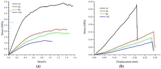 Stress–strain (displacement) curves of heterogeneous models with different immersion time: (a) uniaxial compression condition; and (b) Brazilian splitting condition.
