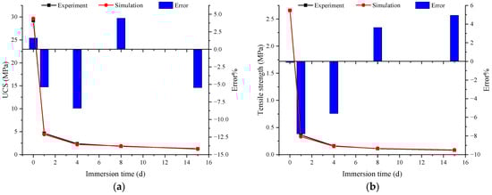 Strength simulation results and errors of heterogeneous models with different immersion time: (a) uniaxial compression condition; and (b) Brazilian splitting condition.