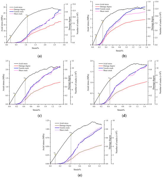 Damage curves of heterogeneous models under uniaxial compression with different immersion times: (a) natural state; (b) 1 day; (c) 4 days; (d) 8 days; and (e) 15 days.