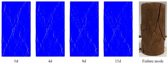 Figure 11 illustrates the relationship between stress, damage degree, and the number of tensile and shear cracks with strain under uniaxial compression conditions for different durations of water immersion. The results indicate that the overall trends of variation in both tensile and shear cracks in the heterogeneous models are similar. The fluctuation of the shear crack curves is evident, especially at 4 and 8 days of water immersion. The tensile and shear cracks of the heterogeneous model tend to be stable near the peak strength only when immersed in water for 0 days and 1 day, which is because tensile and shear cracks may continue to occur even if the stress is small when immersed in water for a long time. In addition, Figure 12 shows the heterogeneous models with different durations of water immersion are primarily dominated by “X-type conjugate shear failure”.