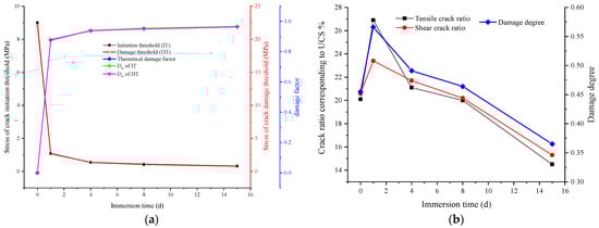 where Dw is the crack threshold damage factor in a numerical simulation, TS0 is the crack threshold of the numerical model in its natural state, and TSt is the crack threshold of the numerical model with t days water immersion. According to Equation (9), the attenuation curves of the crack initiation threshold and damage threshold and the relationship curves of damage parameters with immersion time of the heterogeneous model can be obtained, as shown in Figure 13a. The results indicate that the curve of the meso-scale softening damage factor (theoretical damage factor) with immersion time is very similar to the evolution law of the crack threshold damage factor. Figure 13b shows that both the tensile and shear crack ratio and the damage degree at 1 day of immersion are greater than those without immersion, but then all three show a gradually decreasing trend. The possible reason is that although both contact cohesion and contact tensile strength attenuate nonlinearly, the absolute values of their attenuation are different. In addition, the location of crack initiation and propagation also has a certain randomness due to the heterogeneity; thus, there is a large difference in the number of cracks when the numerical model is broken.