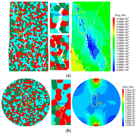 Generally, the failure of the numerical model is the result of the combined action of tensile cracks (T) and shear cracks (S), both of which can be comprehensively determined by the direction of displacement between block units and the magnitude of displacement on either side of the crack. According to Figure 14a, the failure mode can be observed as “X-type conjugate shear failure” and the tensile cracks can be observed locally within the model. According to Figure 14b, it can be seen that the model is primarily tensile fracture. It is worth mentioning that under uniaxial compression, tensile and shear cracks can occur at six types of contact: quartz–quartz, quartz–feldspar, quartz–cement, feldspar–feldspar, feldspar–cement, and cement–cement, among which the three types related to the cement are the main locations where cracks are generated. In the Brazilian splitting numerical simulation, cracks mainly occur at three types of contacts: quartz–cement, feldspar–cement, and cement–cement. The fundamental reason for the above phenomena is that the mechanical properties of cement and the strength of such contact type are significantly lower than those of quartz and feldspar. Therefore, the direction of crack propagation is closely related to the heterogeneity of material composition and contact types.
