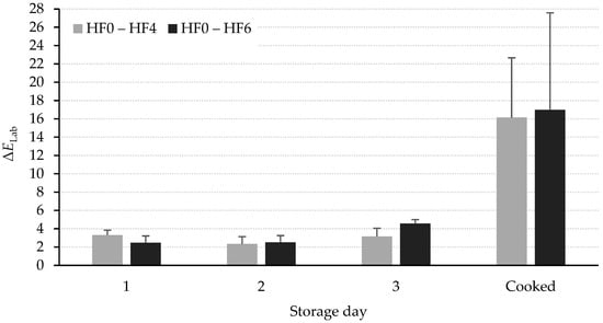 Total colour difference (ΔELab) exceeded the value of 5 between samples in treatments HF0 and HF4 and also between samples in treatments HF0 and HF6 (Figure 2), showing that the control and treated samples had different colours [19].