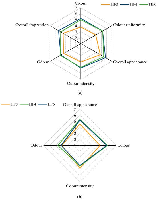 Since there were no significant (p > 0.05) differences between samples from the HF0 and HF4 treatments in terms of redness (a*) values, it can be hypothesised that there was a synergistic effect between the polyphenols present in the hemp flour and the sodium nitrate that resulted in reduced myoglobin oxidation in the samples from the HF4 and HF6 groups. Furthermore, the greater content of hemp flour in the samples from the HF6 treatment resulted in the darkening of the samples and subsequently lower redness (a*) values. The synergistic effect of polyphenols and sodium nitrites has been proposed by other researchers examining plant-based ingredients, i.e., regarding the effect of grape pomace or tea polyphenols on the colour stability of meat products [71,72].