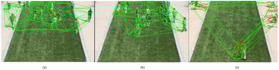 A noteworthy feature that aids in discerning abnormal behaviour is the length of the edges within the Delaunay triangles. In a normal crowd scenario, the edges maintain a consistent length, reflecting the crowd’s relatively uniform distribution. However, when an abnormal event disrupts the crowd, such as scattering due to a sudden disturbance, the edges’ lengths can alter significantly and rapidly. This edge length variation is clearly depicted in the Delaunay triangles illustrated in Figure 2c. The uniformity of the edge lengths is disrupted, with certain edges becoming notably longer than others. This disparity in the edge lengths signifies the occurrence of abnormal behaviour within the crowd. The magnitude and rapidity of these changes are visually evident in the triangulation representation, providing a valuable tool to understand the dynamics of the crowd behaviour.