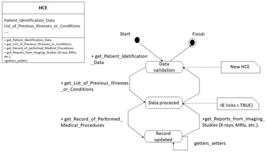 According to the use case diagram, the healthcare professional view can request to initialize the API operation. Figure 3 depicts the state diagram of the HCE class corresponding to the medical history. In this figure, it is possible to observe three states in the API operation: data validation, data processed, and record updated. The method get_Patient_Identification_Data establishes the validation data to reach the validation state. The method get_List_Of_Previous_Illnesses_Or_Conditions locates the information related to the validated user in the medical system. Once the patient’s data are located, the wrapper updates and encapsulates the records according to the HL7 format using the get_Record_Of_Performed_Medical_Procedures methods, getter, and setter. For studies containing images, only the links’ addresses from the imaging area are taken into account. Once this process is complete, the complete record is sent as text. In this way, each instance is generated through the abstract factory according to the medical centers or hospitals where the patient has information.