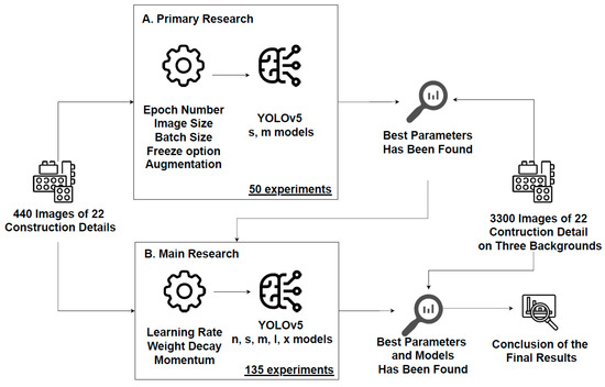 In this investigation, the efficiency of YOLOv5 has been investigated using the newly collected construction details dataset [20]. In construction detail analysis, datasets have a large number of categories, and items have similar features. It is therefore important to investigate the parameters of the dataset and find which of them has the highest influence on object detection. Additionally, one must take into account the size of the chosen YOLOv5 model and the selected training hyperparameters. The training dataset used in the experimental investigation consisted of 440 images (22 construction details on a white background, with 20 images in each category). Additionally, a test dataset consisting of 3300 images (22 construction details on 3 different backgrounds, with 50 images belonging to each category). Because training each model costs a large amount of time, the experimental investigation was performed in two stages. In the first stage, primary research was performed to determine the influence of epoch numbers, image size, batch size, layer freeze option, and data augmentation on object detection results. A total of 50 experiments were performed using the most popular and widely used models of other researchers—YOLOv5s and YOLOv5m. During the primary experiments, the best parameters were found and used in the second stage. In the second stage, a total of 135 experiments were performed using all five models of YOLOv5 (n, s, m, l, x). The main aim was to find the best training hyperparameters, such as learning rate, weight decay, and momentum. The main contributions of the paper are as follows: