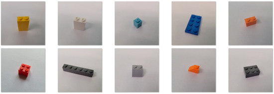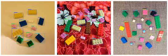 The five best YOLOv5 models obtained in the main research (Figure 5) were evaluated using 150 images. The full results of the correct detection ratio of each construction detail are presented in Table 7. As one can see, the worst detection results are obtained when a mixed background is used. Only in the case of YOLOv5m, was the correct detection ratio larger than 0 and almost all details were recognized at least once. The highest correct detection ratio is obtained when using the white background. Overall, results show that some construction details, like 1x1_h2_round, 2x3_h1 and 2x3_h2, were not detected at all or detected by only few models. The details 2x3_h1 and 2x3_h2 are differed in terms of their height but can look identical from other angles. Some of the construction details were recognized correctly all the time by the YOLOv5m model, for example, 2x8_h1, and 4x4_h1 when the neutral background is used. Summarized results of the additional research show that the YOLOv5m model recognizes the highest number compared with the other four models.