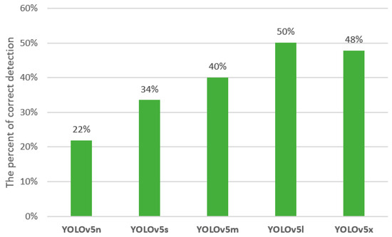 As one can see in Figure 5, the smallest correct detection ratio was obtained using YOLOv5n (22%). The difference between the results of YOLOv5s (34%) and YOLOv5m is equal to 6%, while better results were obtained using YOLOv5m (40%). The results obtained using YOLOv5x (48%) are slightly lower compared with the results of YOLOv5l (50%). In addition, in Figure 6, the curves of precision, recall, mAP@0.5, and map@0.5:0.95 are presented.