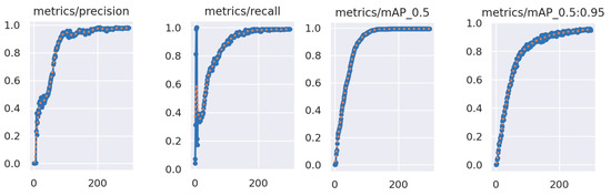 One can see (Figure 6) that, until approximately 200 epochs, the model is still training, and after 200 epochs there is no progress. The recall and the precision metrics of the model are close to 1. In the case of the map@0.5 metric, the model is close to value 1 after 100 epochs. The map@0.5:0.95 metric shows that the accuracy during all 300 training epochs continues to increase.