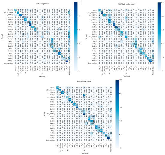 The results of all of the main research experiments are presented in Table 6. In Figure 7 the confusion matrices of the best model on three different backgrounds are presented. As one can see, the smallest number of correct detections was on the mixed background (497). Using this background, two details were not detected at all and were recognized as different construction details. Furthermore, in this case, many details were not assigned to any classes at all, which shows that details merge in the mixed background. On the neutral background, the number of correct detections is larger (562), though the same construction detail as in the case of the mixed background was nevertheless recognized incorrectly. All of the details have been correctly recognized on the white background at least once. On a white background, the number of correct detections is largest (595), therefore in this case, 54% of the construction details were recognized correctly.