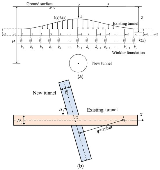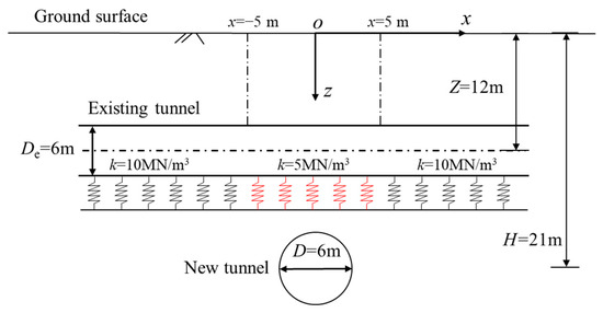 where k(x) and Es(x) are the subgrade reaction coefficient and the soil elastic modulus varying along the longitudinal tunnel axis, respectively; De and Z are the diameter and buried depth of the existing tunnel, respectively; ρ is the depth parameter; ν is the Poisson’s ratio of the soil; (EI)eq is the equivalent longitudinal flexural stiffness of the existing tunnel. It is noted that the original equation in the study of Yu et al. [31] is modified here to make the unit of k(x) be kN/m3.