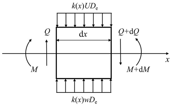 The greenfield tunneling-induced soil settlement is imposed on the existing tunnel, and the force analysis of an element of the tunnel is shown in Figure 2. The following equations can be derived according to the static equilibrium of the element: