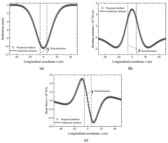Comparison between tunnel responses obtained from proposed method and analytical solution: (a) Settlement, (b) Bending moment; (c) Shear force.