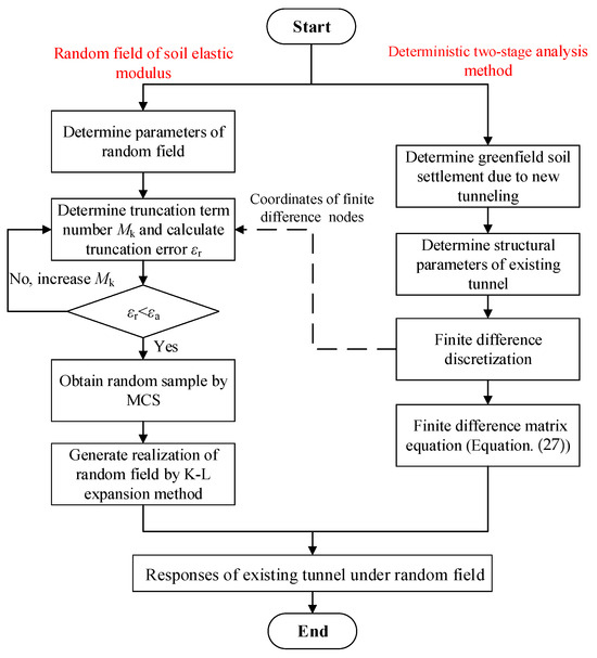 This paper is structured in the following way. First, the establishment and verification of a deterministic two-stage analysis method for the new tunneling–existing tunnel interaction considering longitudinal variation in the subgrade reaction coefficient are presented. Next, the random field of the soil elastic modulus is introduced and discretized to develop the RTSAM. After that, the coupled effect of the variability of soil elastic modulus and the new tunnel undercrossing on the existing tunnel is studied through random analysis. Finally, the main conclusions are given.