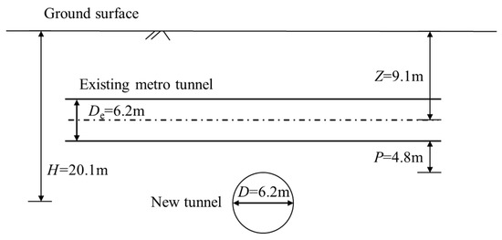 The construction of the underground transportation system has been gradually increasing in major cities. As the most advanced tunnel construction method at present, the shield method has become the first choice for urban tunnel construction in various regions of the world due to its advantages in low environmental impact, high construction efficiency, and high degree of mechanization. Therefore, a large number of existing shield tunnels have been constructed in urban underground space. Shield tunnels are generally assembled from reinforced concrete segments connected with steel bolts. Owing to their structural characteristics, existing shield tunnels are vulnerable to new tunnel construction underneath [1,2,3]. Because of the new tunnel undercrossing, longitudinal tunnel deformations may develop and threaten the safety and serviceability of the tunnel during long-term operation [4,5]. Therefore, the evaluation of tunneling-induced longitudinal deformations of existing shield tunnels has become a growing concern.