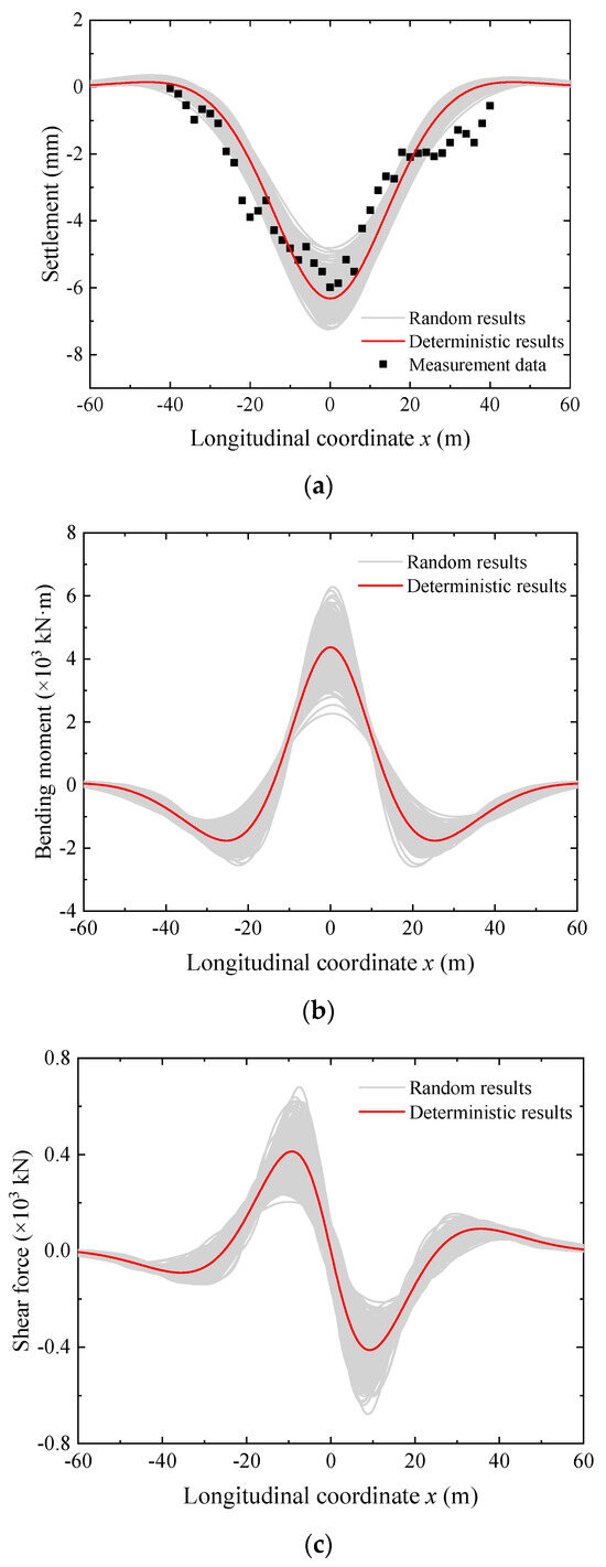 Figure 7 illustrates the longitudinal settlement, bending moment, and shear force of the existing tunnel calculated from 500 random field realizations. The results from the deterministic analysis with a constant soil elastic modulus of 16.49 MPa are also included. As shown in Figure 7, the deterministic results are contained in the distribution ranges of the longitudinal tunnel responses on the basis of the random field. It can be seen that the random results at the extreme points of the response curves exhibit larger variability due to the spatial variability of the soil elastic modulus. The higher uncertainties in these extreme values may result in higher possibilities of maximum tunnel responses exceeding allowable limits. Furthermore, though the greenfield soil settlement due to new tunneling is symmetric with respect to the centerline of the new tunnel, the curves of the longitudinal tunnel responses may show asymmetric profiles because of the asymmetric longitudinal distribution of the soil elastic modulus. The asymmetry is more apparent for the curves of the internal force and cannot be reflected when the longitudinal variation in the soil elastic modulus is ignored. The settlements of the existing tunnel obtained from the measurement data are also shown in Figure 7a. It can be found that most measurement data fall within the random results, which proves the applicability of the proposed RTSAM in practical engineering to a certain extent. The results indicate that the proposed RTSAM can offer the random responses of the existing tunnel under the random field of the soil elastic modulus and provide a simplified methodology for the uncertainty analysis of the longitudinal tunnel responses to new tunneling underneath.