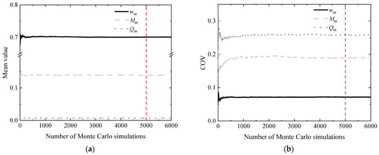Figure 8 illustrates the evolution of calculated mean values and COVs of these dimensionless parameters with the increase in the number of MCS. As shown in Figure 8, the number of MCS can be set as 5000 in the following random analysis to obtain stable statistical results.