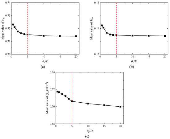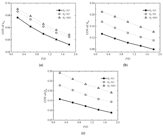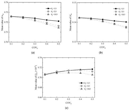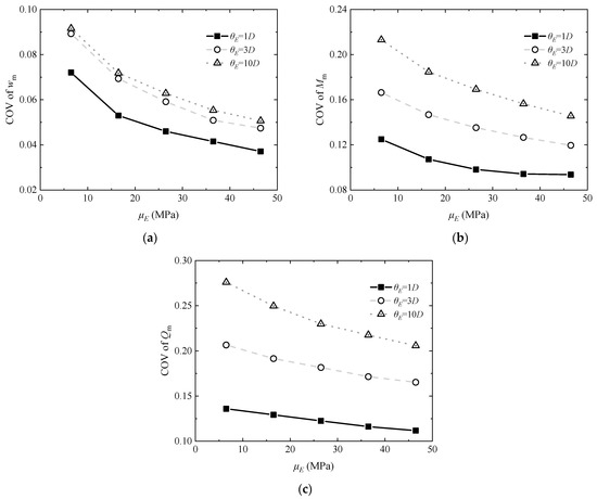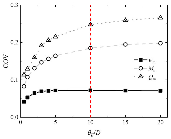 Figure 9 shows the changes in the mean values of the normalized maximum tunnel responses (wm, Mm and Qm) under different SOF θE values. It can be seen that the variation in θE has a slight influence on the mean values of the normalized responses. With the increase in θE from 0.5D to 5D, the mean values decrease slightly at a decreasing rate. The mean values of the normalized responses almost remain stable when θE is larger than 5D. The variations in the COVs of the normalized maximum tunnel responses with increasing θE are presented in Figure 10. As shown in Figure 10, the COVs of the normalized internal forces (Mm and Qm) are always larger than those of the normalized tunnel settlement (wm), indicating that the variability of the normalized internal forces is more apparent under the random field of the soil elastic modulus. The larger θE results in larger COVs of the normalized maximum tunnel responses. This phenomenon can be explained according to the logic of the study of Pan and Dias [37], which investigated the stability of the tunnel face in spatially random soils. When θE becomes smaller, the correlation between the soil elastic modulus of two arbitrary points becomes weaker, which makes the value of soil elastic modulus at different points under a single realization of the random field vary more greatly. The average soil elastic modulus within the influence range of the new tunneling changes less apparently among different random field realizations because of the decrease in θE, and the normalized maximum tunnel responses obtained through different realizations become closer to each other. When θE is relatively large, the average soil elastic modulus under different realizations varies significantly, which leads to an increase in the variability of the normalized maximum tunnel responses. The COVs of the normalized maximum tunnel responses increase remarkably when θE varies in the range from 0.5D to 10D. However, the variation of θE has a limited effect on the COVs of the normalized responses when θE is larger than 10D.
