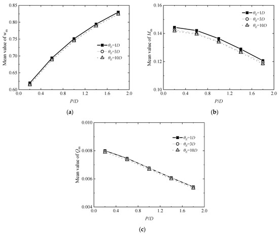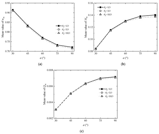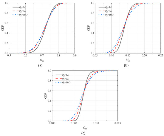 The empirical cumulative distribution functions (CDFs) of wm, Mm, and Qm under different θE (θE = 1D, 3D, 10D) are shown in Figure 11. The distribution ranges of wm, Mm, and Qm under θE = 1D are the narrowest, while the distribution ranges under θE = 10D are the widest. Therefore, the increasing θE leads to higher probabilities of the occurrence of large wm, Mm, and Qm. For example, with the increase in θE from 1D to 10D, the probability of Mm > 0.17 increases from 0.03 to 0.1. The findings presented here align with the results shown previously, i.e., the COVs of wm, Mm, and Qm under θE = 10D are the largest. Moreover, it is also seen that the CDF curves rotate clockwise about their intersection point as θE increases.
