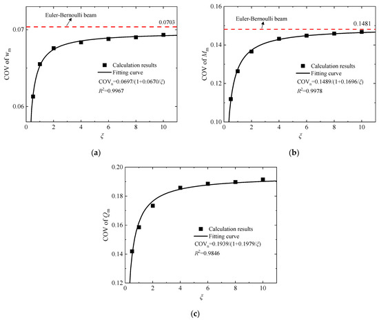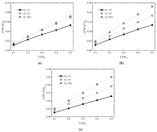 Figure 12 illustrates the changes in the mean values of the normalized maximum tunnel responses with increasing COVE under different θE (θE = 1D, 3D, 10D). The effect of the COV of the soil elastic modulus on the mean values of the normalized responses is not very obvious. The increasing COVE induces slight decreases in the mean values of wm and Mm. Furthermore, it is observed that the increase in COVE amplifies the effect of the variation in θE on the mean values of the normalized maximum tunnel responses. The variations in the COVs of the normalized maximum tunnel responses with increasing COVE under different θE (θE = 1D, 3D, 10D) are shown in Figure 13. The increase in COVE results in an approximately linear increase in the COVs of the normalized responses. It is worth noting that the maximum slope is observed at the maximum θE (10D), whereas the minimum slope can be seen at the minimum θE (1D). For example, the slope of variation in Mm with increasing COVE under θE = 10D is about 1.7 times larger than that under θE = 1D. Therefore, the results imply that the increasing θE strengthens the effect of the variation in COVE on the variability of the tunnel responses.