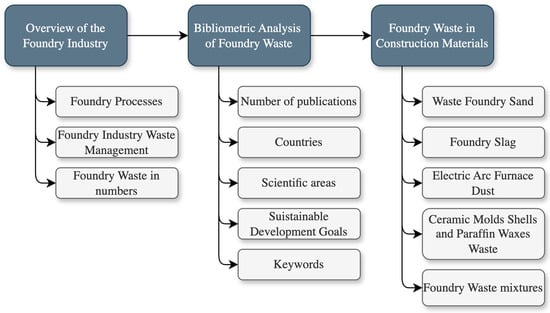 The final part shows the valorization of foundry waste in construction materials. This analysis utilized articles published in the last 10 years. The articles were thoroughly analyzed to identify suitable materials for inclusion in the study. Figure 1 illustrates the topics addressed in this review.