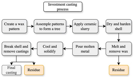 In investment casting, two main residues are generated: the ceramic mold shell and the wax. According to AFS reports, investment foundries purchase 20.4 million tons of virgin wax annually [66]. Another major problem lies in the ceramic mold shell, which constitutes the majority of the waste in investment casting, representing 60% of the total generated, highlighting the importance of recycling and proper management of this process [54].