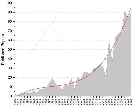 A bibliometric analysis was conducted to show the interest of the scientific community in this topic and to understand the trends. The research in the database was conducted using the topic “foundry waste” in the Web of Science database. From the first publications until 2023, there has been a significant increase in the number of published articles. Considering the period between 1986 and 2023, the number of published articles increased by 4400%. In the last 10 years, the increase was approximately 182%, which is also a remarkable growth. The analysis reveals a growing interest in the topic of foundry waste (Figure 5). This trend indicates that the topic has gained popularity in academic and research fields, possibly due to growing environmental concerns and the need for sustainable waste management strategies in the foundry industry, with greater emphasis in recent years resulting from the strategies adopted by the European Union.