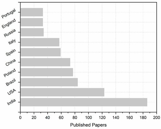 Another analysis relates the number of publications to the countries involved. There are publications on the topic of “foundry waste” in 74 countries. The 10 countries with the highest number of publications in this area are represented in Figure 6. It can be stated that there is also a relationship with the production of this type of waste, since some of these countries are also the world’s largest producers of castings and consequently of foundry waste, such as China, India, the USA, Brazil, and Russia. These five countries are responsible for about 42% of the existing publications, thus highlighting their prominent role in this field of study and indicating a correlation between waste production and research activity.