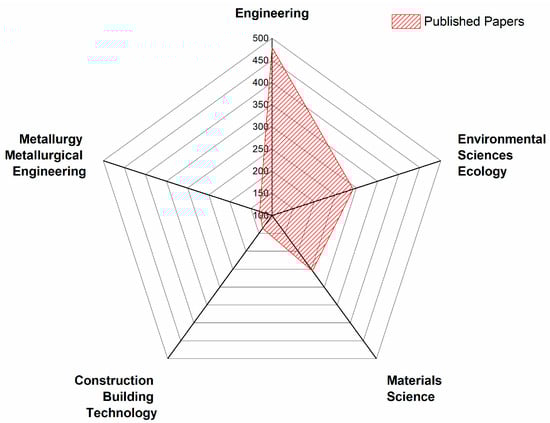 Figure 7 presents the scientific areas that have developed the most scientific articles in this research domain. These five areas are responsible for about 72% of the publications. The contributions of the environmental sciences suggest a focus on environmental impact, and the significant number of publications in materials science and construction technology highlights the interdisciplinary nature of research on foundry waste, as these areas are important for the development of sustainable materials and construction practices.